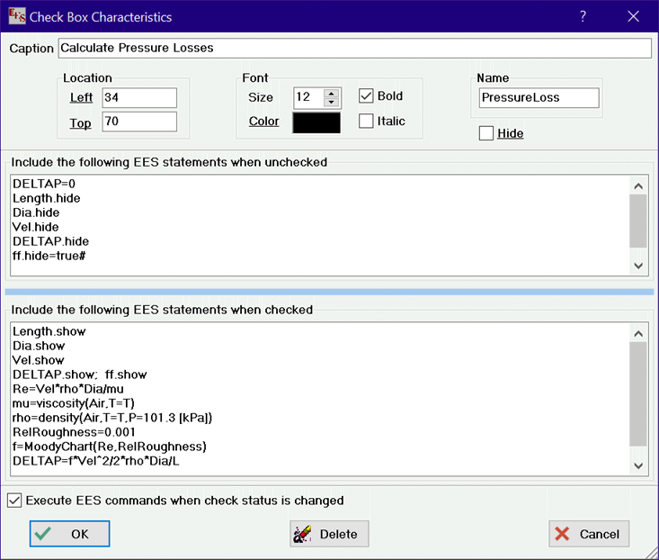 The checkbox can be given a name. If a name is provided, the attributes shown with underlined text can be set with EES variables. For example, the left position of the check box in the example below could be specified by setting the value of PressureLoss.left. The specific variables that can be set in the Equations window for a check box are: