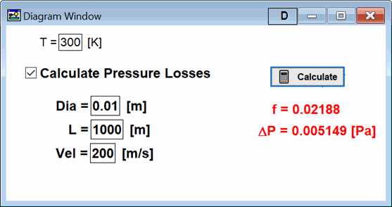 If "Execute EES commands when check status is changed" is selected, EES will attempt to execute the commands in the unchecked or checked window, depending on the setting of the check box, directly after the change is made to the check box. This capability is most useful when the check box setting affects the display in the Diagram window in some way. In the example below, some text inputs and outputs are immediately hidden if the check box to calculate pressure losses is not selected. Graphical objects and buttons can be hidden or positioned in this manner as well. Note that the width and height of this dialog can be changed by dragging the triangular control at the bottom right of the dialog window. Also, the sizes of the edit controls used to hold the equations can be changed by dragging the sky blue splitter bar between the edit controls up or down.