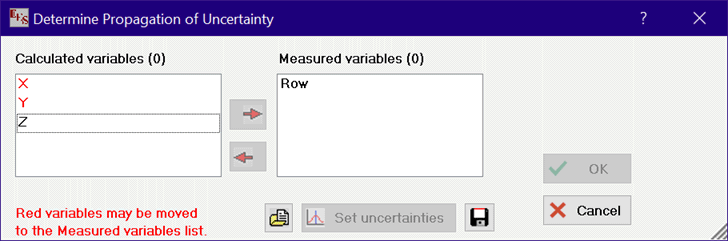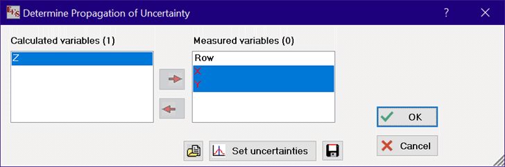 Select one or more variables (up to 6 for the Annual license, 12 for the Commercial license and 50 for the Professional licemse) for which the uncertainty propagation is to be determined from the list on the left. Select one or more Measured variables from the list on the right. The maximum number of Measured variables is 10 for the Annual license, 30 for the Commercial license and 200 for the Professional license. To specify the uncertainty associated with the Measured variables, click the Set Uncertainties button below the right list. A second dialog window will appear in which the absolute or relative (fraction of the measured value) uncertainties for each selected measured variable can be specified. An uncertainty value for each measured variable must be provided. Note that the uncertainty value can be supplied using another variable. Click the OK button to set the uncertainties and close the Specify Uncertainties dialog window. Click the OK button Uncertainty Propagation dialog to start the calculations.