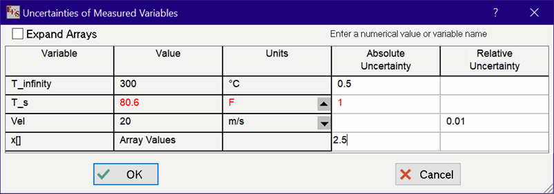 The Professional license allows the uncertainty values to be entered in either the main or the alternate set of units. Clicking on the up/down arrows in the units column toggles the display from the main set to the alternate set of units, which is shown in red, as seen in the example below. If array variables are among the selected measured variables, the Professional license will provide the option to treat all of the variables in the array as one variable. This option is invoked by unchecking the Show Array Variables check box at the upper left of the dialog. In the example below, specifying the uncertainty for x[] sets the uncertainty for all array elements in the x array that are in the measured variables list.