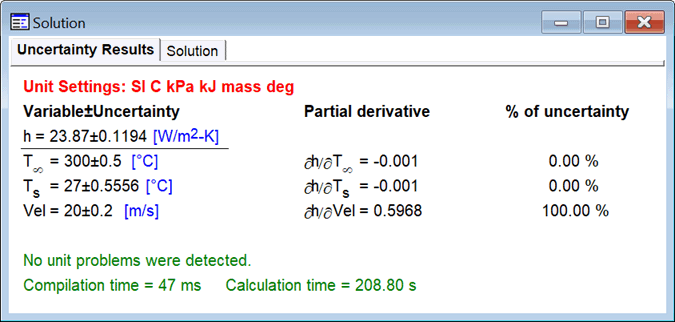 Click OK for both dialogs to initiate the uncertainty calculations. After the calculations are completed, EES will display an abbreviated Solution Window containing the calculated and measured variables and their respective uncertainties. The uncertainty associated with the calculated variable can be assigned to another EES variable using the UncertaintyOf function. The partial derivative of the calculated variable with respect to each measured variable will be displayed. In addition the % of the total uncertainty in the calculated variable resulting from the uncertainty in each measured variable will also be displayed. This % is calculated as the ratio of the square of the product of the partial derivative and uncertainty of each measured variable to the square of the uncertainty in the calculated variable.