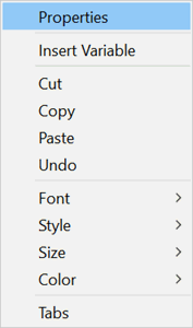 The Diagram window must be in Development mode in order to edit the Formatted text item. Select the item by clicking on it. Click again at the point that you wish to edit. Text can then be edited in the usual manner. Formatted options are available by clicking the right mouse button which will display the following popup menu.